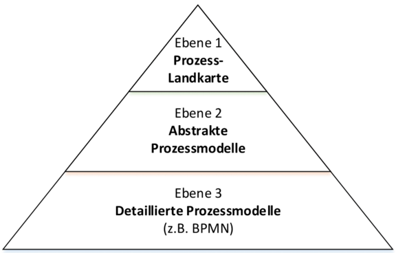 Le niveau supérieur (niveau 1) est souvent présenté sous la forme d’une chaîne de valeur et est appelé cartographie des processus. Le niveau de détail moyen (niveau 2) montre les processus d’une entreprise sous une forme abstraite, agrégés en processus abstraits par produit, marché ou par autres propriétés spécialisées. Ce n’est qu’au niveau de détail inférieur (niveau 3) que nous trouvons des organigrammes qui peuvent être modélisées par exemple avec BPMN 2.0.