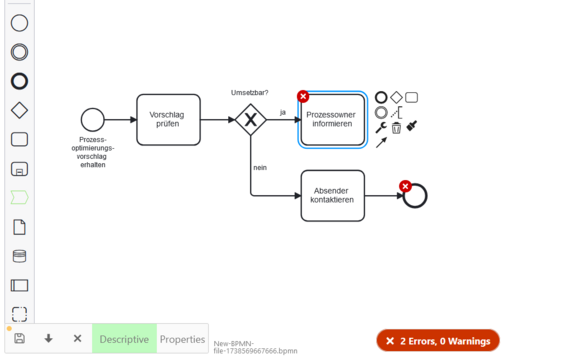 Beispielsweise wurde ein einfacher Prozess auf der deskriptiven Ebene modelliert, welcher aber noch Fehler beinhaltet und unvollständig ist. Das Tool erkennt dies und meldet es über die Fehlermeldungen gleich dem Nutzer.